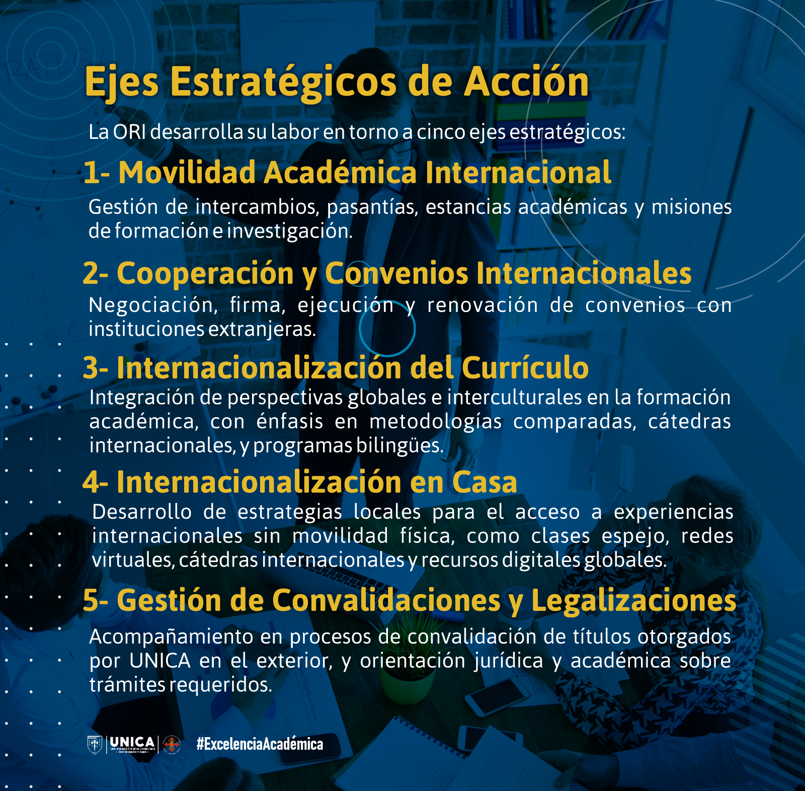 La Oficina de Relaciones Internacionales es una instancia estratégica de UNICA que traduce la vocación misionera de la universidad en acción global concreta. Con su labor, se fortalece el sentido de pertenencia a una comunidad académica universal, comprometida con la transformación de la realidad, la construcción de paz y la formación de ciudadanos del mundo capaces de responder, con responsabilidad ética, profesional y espiritual, a los desafíos de nuestro tiempo.